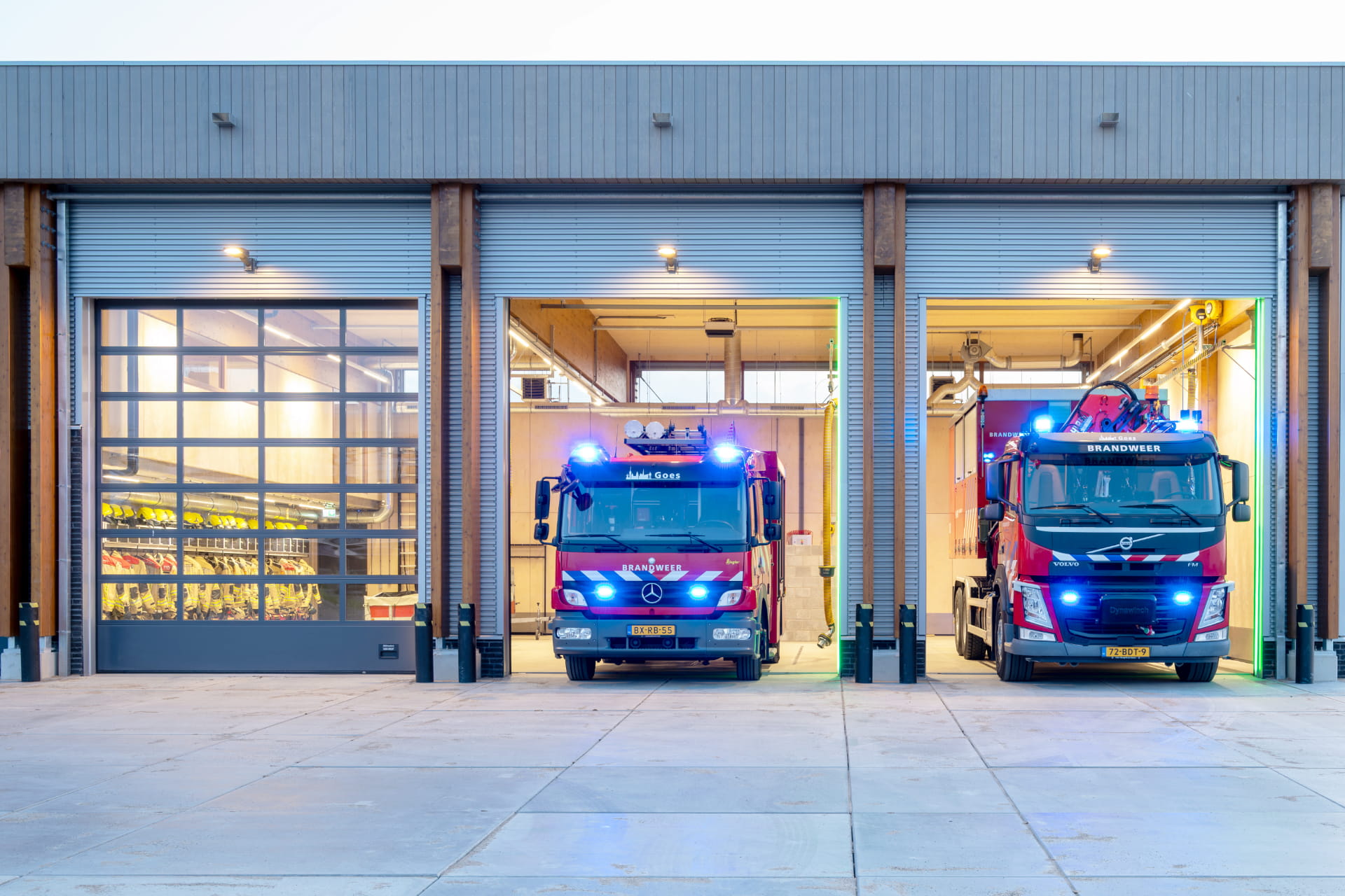 De brandweerpost is vormgegeven als een horizontaal, transparant venster bovenop een bloemendijk. Dit nieuwe dijklichaam is onderdeel van het ontwerp. De remise douche en omkleedruimtes zijn achter het dijklichaam geplaatst, waardoor het gebouw in het landschap opgaat. Zo is de brandweerpost tegelijk goed zichtbaar én maximaal ingepast in de hoofdgroenstructuur rondom Goes.